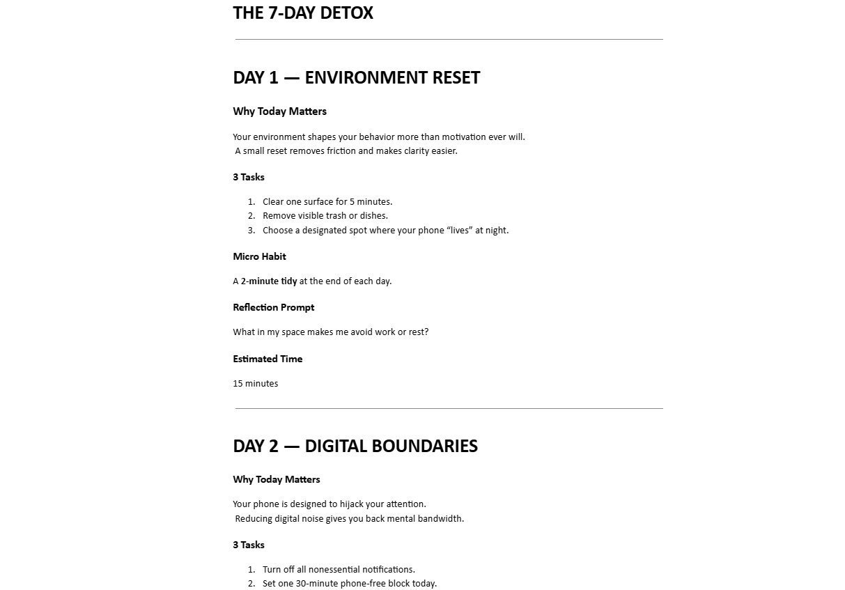 You follow one simple task per day, supported by short prompts, trackers, and reflection pages. Each step builds on the last, so the reset feels structured and easy to follow.