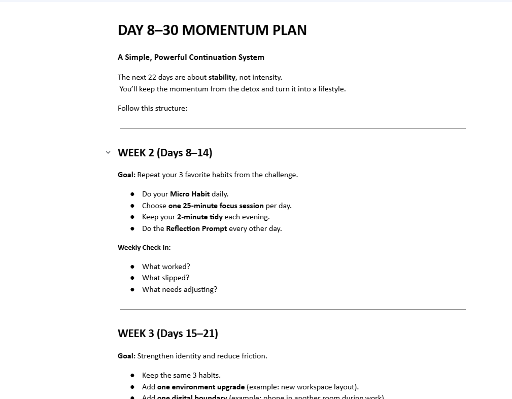 You get a built‑in Day 8–30 Momentum Plan that helps you turn your new-learned habits into long‑term change.